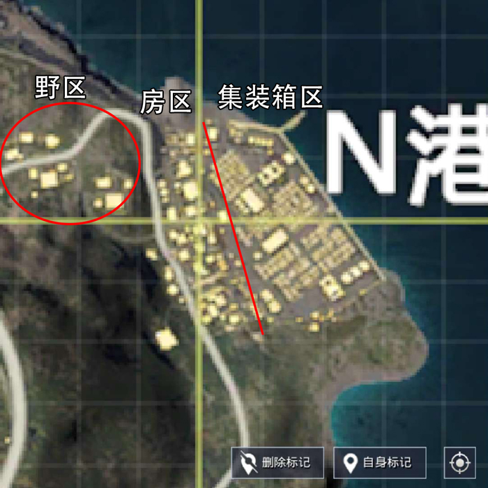 本着不落地成盒的原则我们选择几乎没有竞争压力的野区,野区虽然资源上差了一点不过地势高,可以很好的观察整个N港。我们选择野区的厨房楼当做落地点,然后搜完同侧的三栋建筑物以后根据情况看要不要去对面的迷宫楼搜。